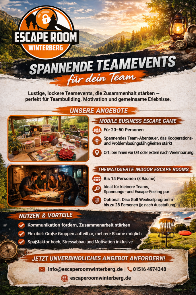 Auch bei Escape Room Winterberg neigt sich der Winter dem Ende zu und wir freuen uns, Euch mitteilen zu können, dass wir ab April bis Oktober wieder unser beliebtes Mobilen Business Escape als Indoor -Aktivität für Gruppen von 16 bis 24 Personen anbieten! Egal, ob Ihr bei uns oder an einer von Euch gewünschten Location teilnehmen möchten, wir gestalten Euer Teambuilding-Erlebnis ganz nach Euren Vorstellungen.